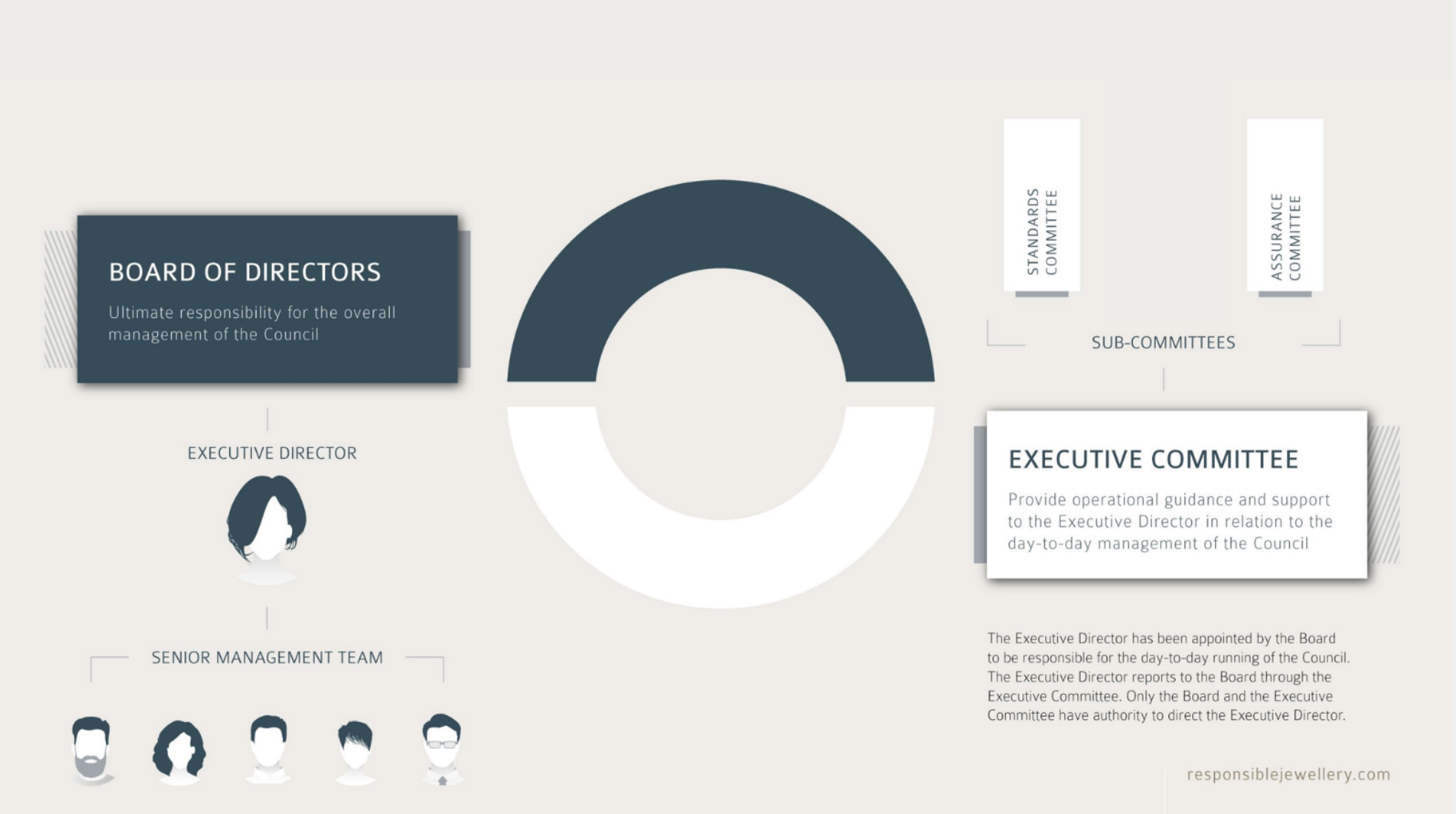 The Responsible Jewellery Council (RJC) is the trading name of the Council for Responsible Jewellery Practices Ltd. We are a registered not-for-profit (NFP) company with our headquarters registered in the UK. The RJC is governed by a Board of Directors and an Executive Committee. The day-to-day management is delegated to a Senior Management Team headed by an Executive Director.